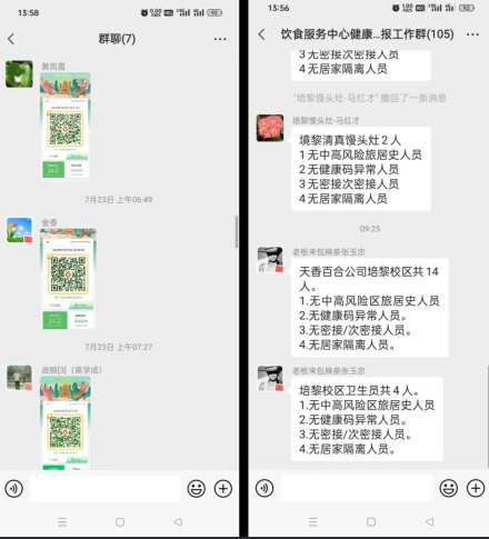 饮食服务中心第一时间积极与返家的食堂员工取得联系,精准摸排省内外和在兰的169名员工的健康状况,建立了食堂员工返家健康登记表、食堂从业人员台帐,督促员工积极配合当地做好返家后的健康报备、健康监测等健康管理措施,严格按当地要求做好疫情防控工作各餐饮公司每天在饮食服务中心健康群上报员工的健康码和核酸检测,及时跟踪员工在异地的健康情况,做到离校不脱管,确保每一位员工生命安全和身体健康,筑牢疫情防控线。