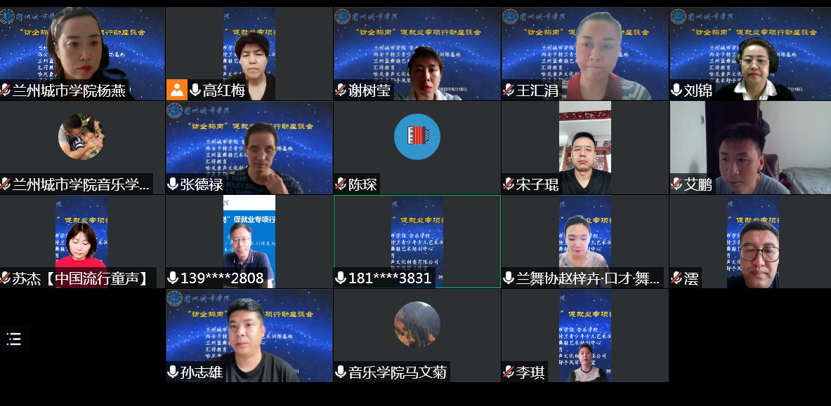 为深入贯彻落实党中央、国务院和教育部、省教育厅关于高校毕业生就业工作的决策部署,继续拓宽毕业生就业渠道,全面推进学生就业工作,8月15日下午,beat365官方网站音乐学院与卡特兰青少年少儿艺术训练基地、兰州蓝舞鞋艺术培训中心、汇得教育、哈尼童声文化创意有限公司、宁波米舒手风琴工作室等5家企业开展“访企拓岗促就业”专项行动线上交流会。校党委常委、副校长赵有翼,招生就业处负责人,音乐学院党政领导班子成员、系主任、学院办公室主任、团学办主任、毕业班班主任和企业方负责人参加会议。