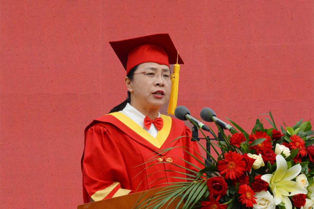 她寄语毕业生,希望你们把勤奋、奋斗、坚强、光荣、梦想继续带入自己的行囊,自信、自立、自强,陶熔品性,拔尖能力,努力成为不负国家不负时代的优秀人才。