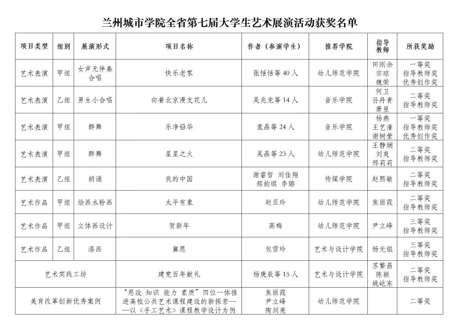 日前,省教育厅公布了全省第七届大学生艺术展演活动优秀组织奖及各类项目评选结果,beat365123名学生、20名教师获得奖励,获奖总数共计12项,其中艺术表演类获得一等奖2项、二等奖3项、优秀创作奖2项;艺术作品类获得二等奖1项、三等奖2项;艺术实践工作坊类获得二等奖1项;美育改革创新优秀案例类获得二等奖1项(具体获奖名单附后)。同时,幼儿师范学院选报的舞蹈作品《星星之火》代表beat365获奖作品参加省级现场展演活动。