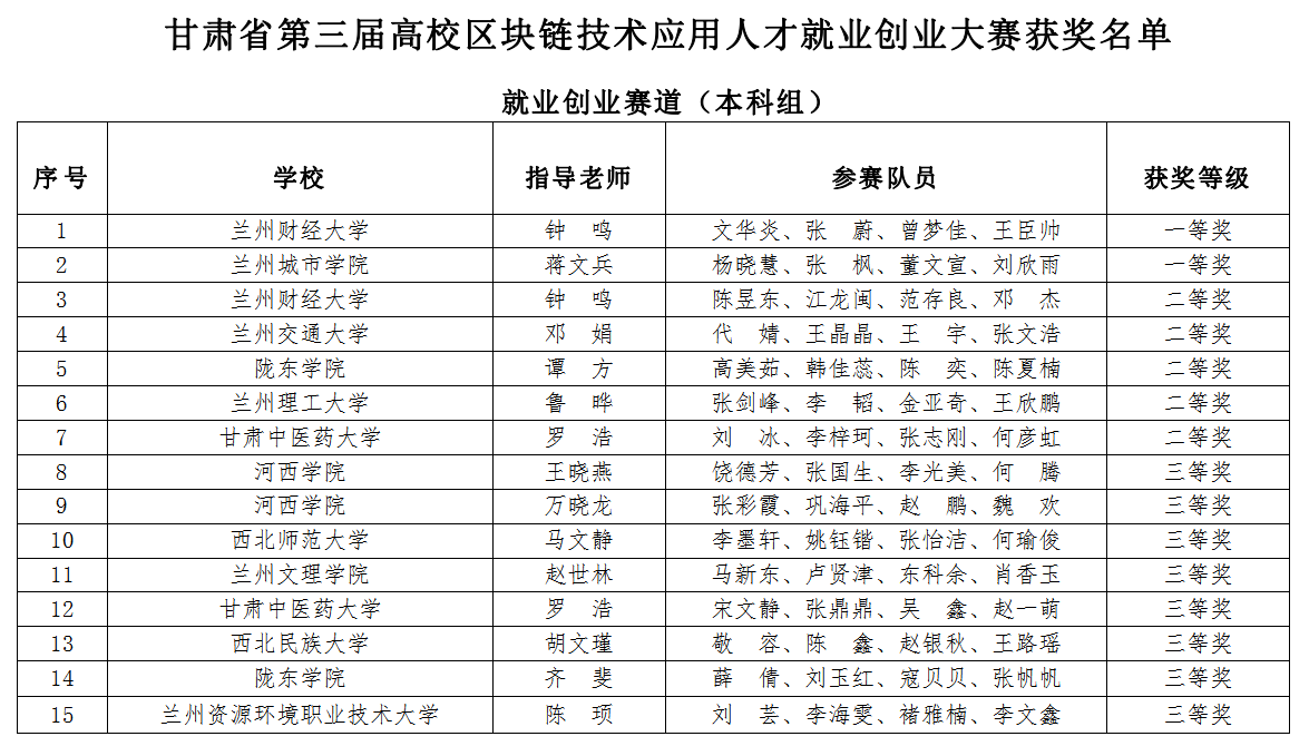 近日,甘肃省教育厅公布了甘肃省第三届高校区块链技术应用人才就业创业大赛获奖名单,由beat365教师蒋文兵指导,杨晓慧等同学组成的团队荣获大赛就业创业赛道省级一等奖。本次大赛的主题为“数智赋能 就创未来”。