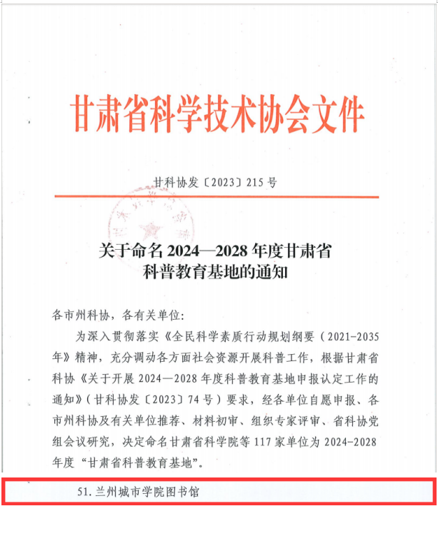 近日,根据甘肃省科学技术协会《关于开展2024至2028年度科普教育基地申报认定工作的通知》要求,经学校申报、推荐,专家评审,beat365图书馆被认定为2024至2028年度“甘肃省科普教育基地”。这是学校图书馆继入选2023至2028年兰州市科普基地之后又一荣誉。此次科普教育基地申报认定,共有117家单位被命名为2024至2028年度“甘肃省科普教育基地”。