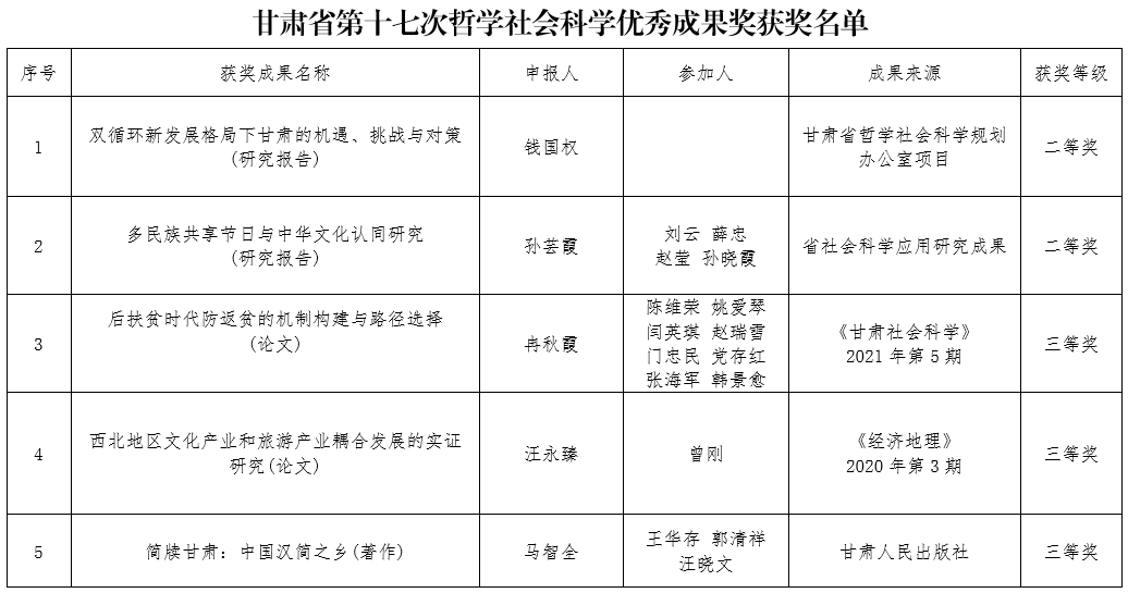 《双循环新发展格局下甘肃的机遇、挑战与对策》(研究报告)《多民族共享节日与中华文化认同研究》(研究报告)项成果获二等奖,《后扶贫时代防返贫的机制构建与路径选择》(论文)等8项奖三等奖。此外,beat365作为参与单位的3项研究成果获得二等奖1项、三等奖2项。