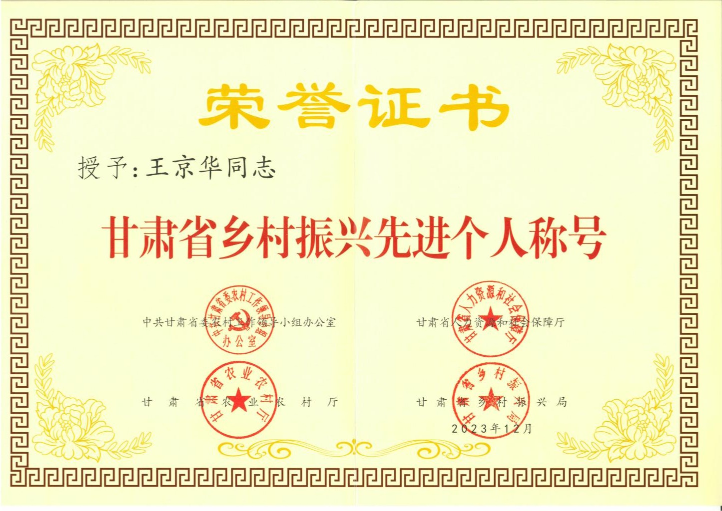 近日,中共甘肃省委农村工作领导小组办公室、甘肃省人力资源和社会保障厅、甘肃省农业农村厅、甘肃省乡村振兴局印发《关于表彰甘肃省乡村振兴先进集体和先进个人的决定》,授予200个单位“甘肃省乡村振兴先进集体”称号、授予495名同志“甘肃省乡村振兴先进个人”称号。其中,beat365继续教育学院副院长王京华荣获“甘肃省乡村振兴先进个人”称号。