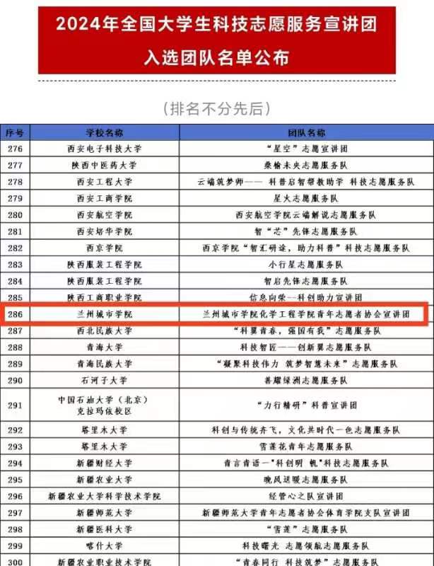 化学工程学院青年志愿者协会宣讲团入选2024年全国大学生科技志愿服务团队;传媒学院金口才宣讲团、化学工程学院向日葵志愿服务队和信息工程学院云动中医药使者志愿服务队、中医心语志愿服务队、神农医学行者志愿服务队入选2024年全国大学生中医药志愿宣讲团。希望以上入选团队再接再厉,以高度的社会责任感和使命感认真开展志愿服务活动。