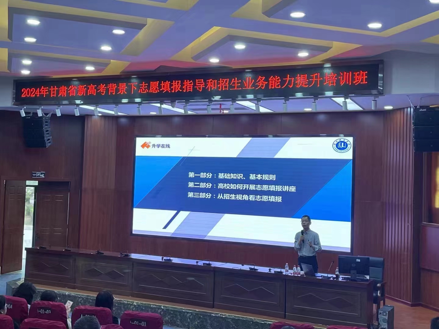 在培训中,升学在线研究院院长程亚、兰州大学招生办公室副主任陈刚、升学在线研究院执行院长刘涛,分别做了《新时代高校招生挑战与应对策略》《甘肃省普通高等学校招生考试和录取工作实施方案解读》以及《面向考生甘肃志愿填报如何开展》的报告。