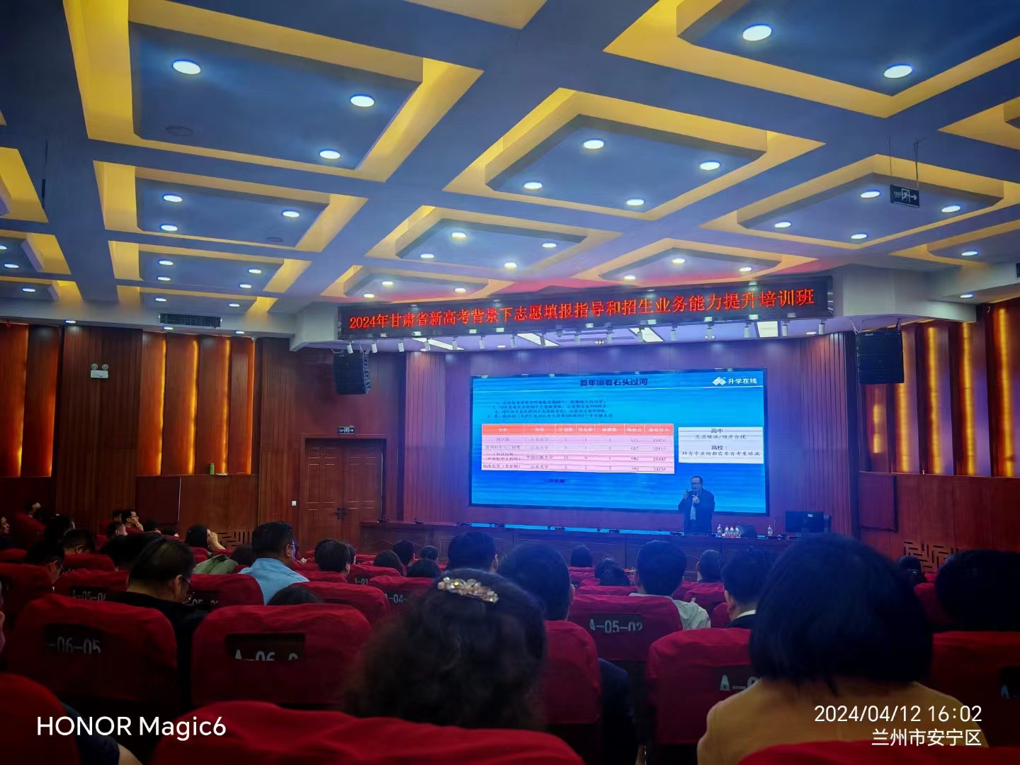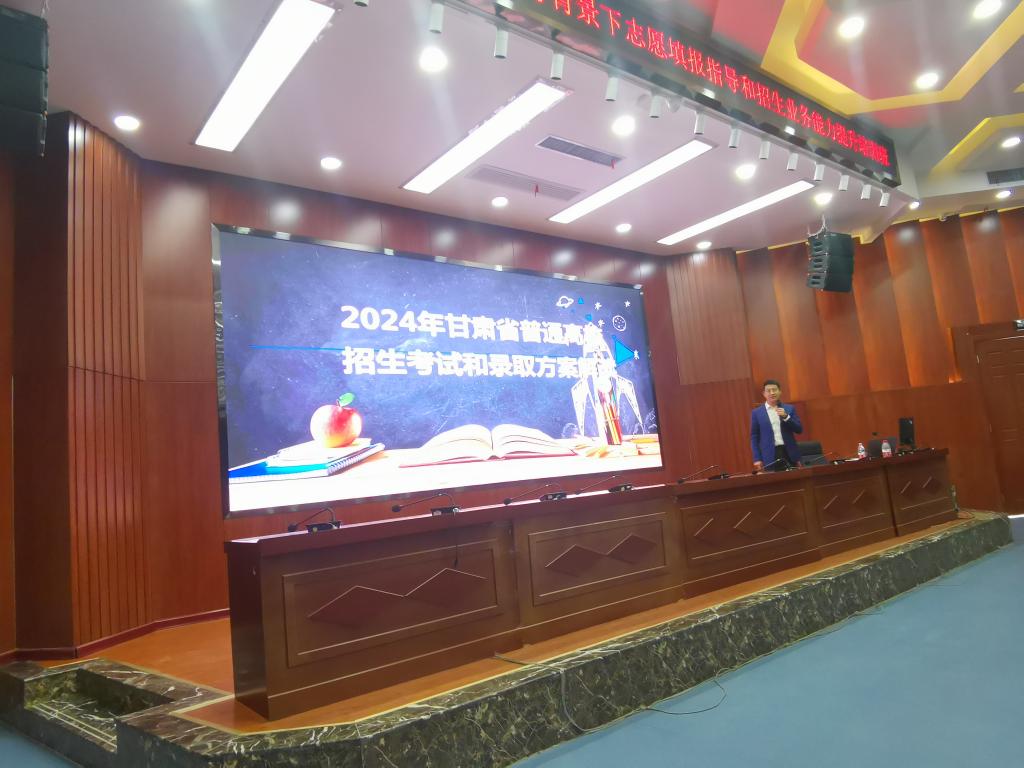 为确保 2024 年甘肃省高考综合改革平稳实施,加大改革政策宣传解读力度,为我省考生做好新高考背景下志愿填报指导以及在新环境下各高校招生宣传的突破,由升学在线主办,beat365官方网站承办的2024 年甘肃省新高考背景下志愿填报指导和招生业务能力提升培训班于4月12日下午在beat365官方网站大学生活动中心举行,来自兰州大学、西北师范大学、甘肃农业大学、甘肃中医药大学、兰州财经大学、天水师范学院、兰州资源环境职业技术大学等18所高校的200余位高校招生负责人及相关老师参加了本次培训。