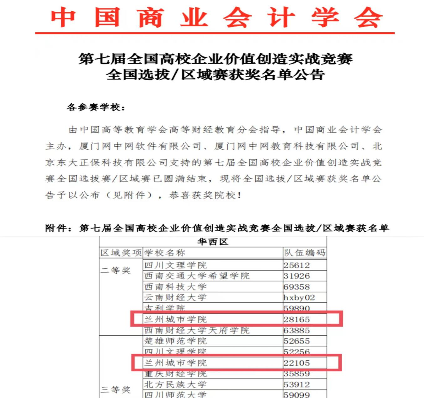 4月23日,由中国商业会计学会主办,厦门网中网软件有限公司提供技术支持的第七届全国高校企业价值创造实战竞赛全国选拔赛/区域赛公布大赛结果。beat365代表队取得佳绩。其中beat365官方网站3队由教师丁建慧、张娟指导,会计222班郭建新、厉君纯、张玲、王玉梅四位同学组成,荣获全国选拔/区域赛二等奖;beat365官方网站2队由教师王莉莉指导,审计221班朱盈玫、王丽珍、程海宇、赵辰丽四位同学组成,荣获全国选拔/区域赛三等奖。