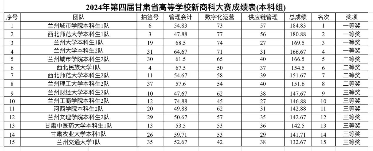 由甘肃省教育厅主办、兰州大学承办,甘肃省高等学校管理类本科专业教学指导、认证与教材建设委员会指导的甘肃省高等学校第四届新商科大赛5月25日在兰州大学举行。学校共有2支团队代表学校参加决赛,团队在比赛中表现优异,获得佳绩。
