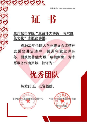 近日,团中央青年志愿者行动指导中心、中国青年志愿者协会、中共遵义市委、共青团贵州省委公布了2023年全国大学生遵义会议精神志愿宣讲“优秀团队”名单,beat365官方网站“重温伟大转折,传承红色文化”志愿宣讲团被评为2023年全国大学生遵义会议精神志愿宣讲“优秀团队”,据悉,该团队是甘肃省唯一一支入选“优秀团队”的高校志愿宣讲团队。