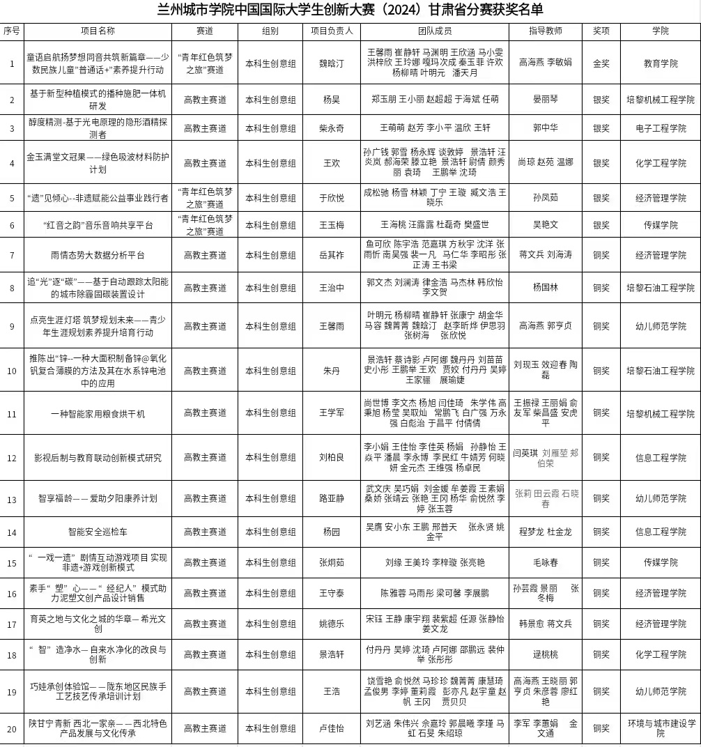 本届大赛自5月份启动以来,经过院级初赛、校级通讯赛,beat365推荐23个优秀项目代表学校参加甘肃省分赛决赛,最终获省级金奖1项、银奖5项、铜奖14项,学校获得优秀组织奖。
