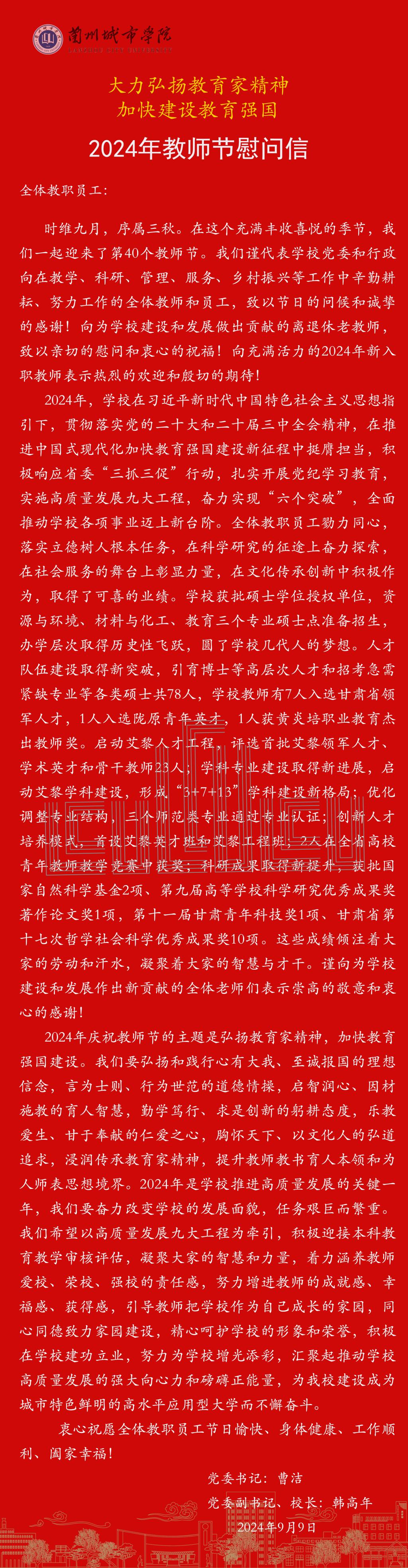 大力弘扬教育家精神 加快建设教育强国——2024年教师节慰问信