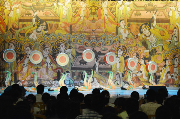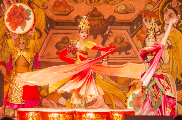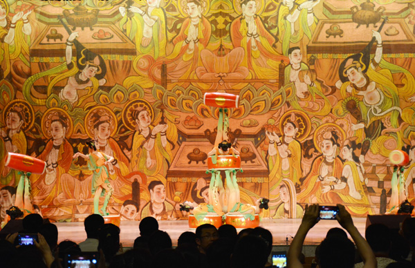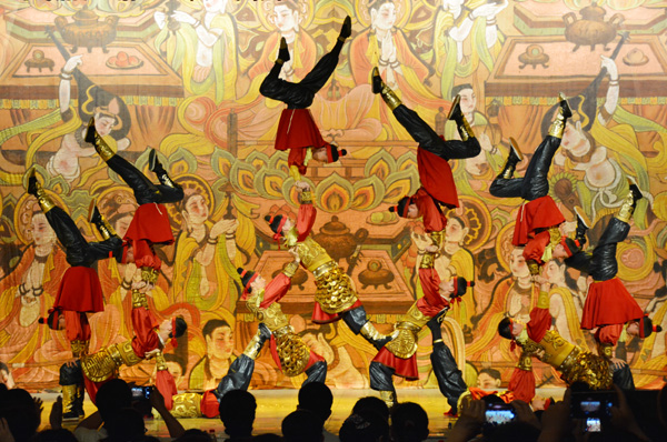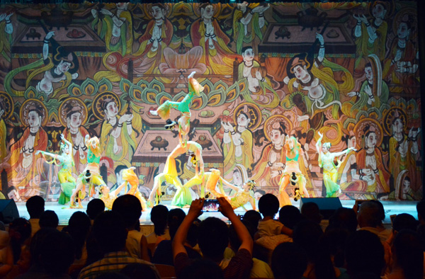 演出当晚,敦煌飞天的舞台背景、绚丽的舞台灯光、华美鲜艳的盛唐以及异域服饰、演员们精湛娴熟的杂技技艺、柔软妩媚的舞蹈身姿将整场演出一次次推向高潮,现场观众掌声不断。