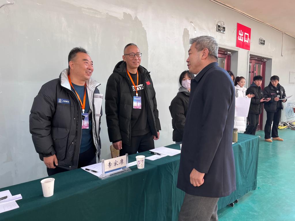 邓伟与评审专家进行亲切交流,鼓励他们继续发扬爱岗敬业、无私奉献的精神,为培养更多优秀的体育人才贡献自己的力量,同时针对当前体育教学工作中存在的问题和不足提出意见建议。