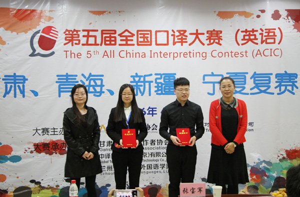 4月16日上午,全国第五届口译比赛(英语)甘肃、青海、宁夏、新疆复赛区复赛颁奖仪式在兰州理工大学逸夫科技馆举行。beat365副校长、甘肃省翻译工作者协会会长姜秋霞出席仪式并致辞,为获奖选手颁奖。