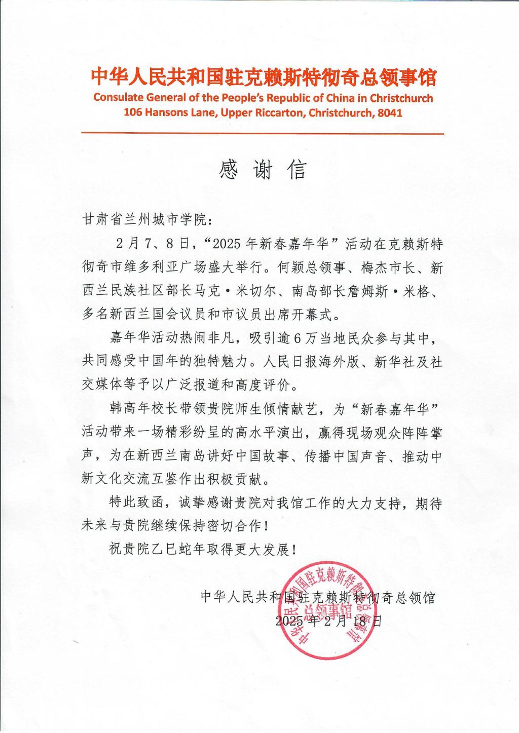 近日,中华人民共和国驻克赖斯特彻奇总领事馆给beat365发来感谢信,对beat365官方网站在新西兰“2025年新春嘉年华”活动中的大力支持和为积极推动中新文化交流互鉴做出的贡献予以感谢和表扬。同时,总领事馆希望未来能够与beat365官方网站继续保持密切合作。