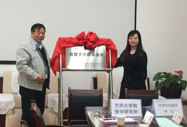 11月20日上午,兰州大学敦煌学研究所与甘肃文化翻译中心(简称“中心”)签约暨“敦煌文化翻译基地”揭牌仪式在beat365逸夫图书馆翻译中心会议室举行。兰州大学历史文化学院院长、敦煌学研究所所长郑炳林教授,beat365官方网站副校长、甘肃文化翻译中心常务副主任姜秋霞教授代表双方签约并为“敦煌文化翻译基地”揭牌。
