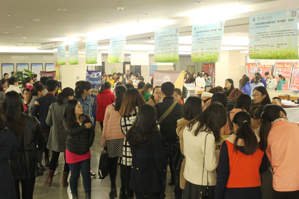 11月6日,学校在逸夫图书馆一楼成功举办2016届毕业生“双向选择”洽谈会。本次双选会是学校“就业服务月”活动的重头戏之一,共邀请到甘肃中海投资管理有限公司、甘肃七田阳光教育咨询有限公司、红杉教育、兰州義狼网络策划有限公司等20家单位,为2016届毕业生提供了销售、文员、教师等600多个工作岗位。在招聘会现场,各用人单位通过发放宣传单、张贴海报等形式向毕业生展示了单位规模、工作环境及薪资等方面的信息。参会毕业生热情高涨,积极与单位交流。据统计,最终有近300人与用人单位初步达成就业意向。