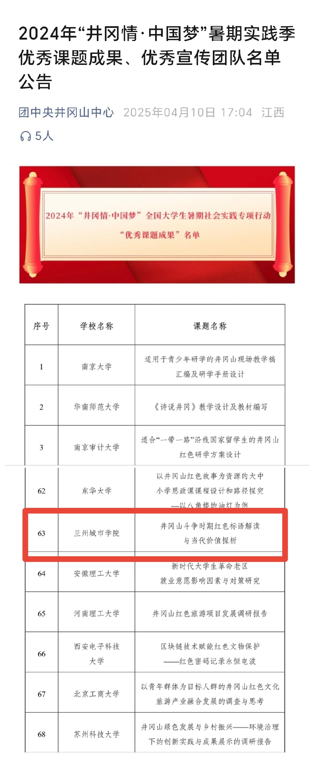 “井冈情·中国梦”全国大学生暑期社会实践专项行动由团中央青年发展部指导,全国青少年井冈山革命传统教育基地管理中心主办,旨在深入学习宣传贯彻习近平新时代中国特色社会主义思想,全面贯彻落实党的二十大和二十届二中、三中全会精神,充分激发广大青年为中国式现代化挺膺担当。此次专项行动吸引了来自全国254所高校积极参与,竞争异常激烈,最终成功入选75项“优秀课题成果”、32支“优秀宣传团队”。