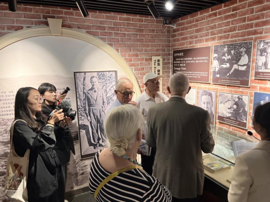 14日下午,乔治·何克亲友团赴培黎校区参观。在何克广场,来宾向何克雕塑敬献了花篮,寄托深厚的追思之情。在培黎展览馆,何克的亲友们驻足在一幅幅艾黎与何克创办教育、开展“工合”运动、与中国人民并肩抗战的生动图景前,聆听讲解、拍照留念。英中了解协会理事安德鲁·希克斯在展示厅与来宾们分享了百余张珍贵照片,这些照片是从曾在培黎学校任教的、来自英国、新西兰、加拿大等国的外籍教师的亲属中征集到的,首次在公开场合亮相。安德鲁·希克斯将照片赠送给了路易·艾黎研究中心。