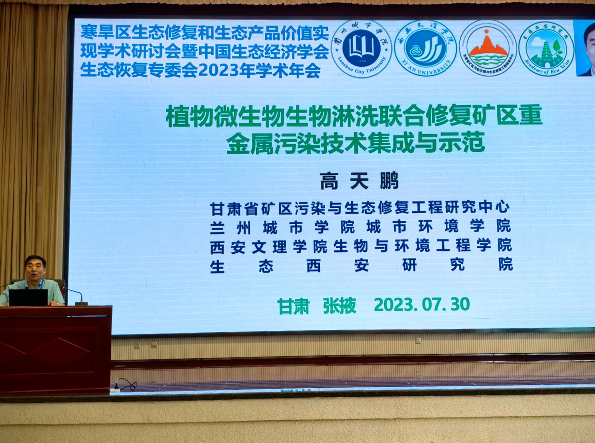 与会专家学者围绕“寒旱区生态修复和生态产品价值实现”主题进行主旨报告。beat365官方网站城市环境学院特聘教授、中国生态经济学会生态恢复专业委员会副主任委员、甘肃省矿区污染治理与生态修复工程研究中心主任、生态西安研究院院长高天鹏应邀参加论坛,在第一分论坛(主题为寒旱区生态系统保护与修复)作了题为《植物微生物生物淋洗联合修复矿区重金属污染技术集成与示范》的报告。