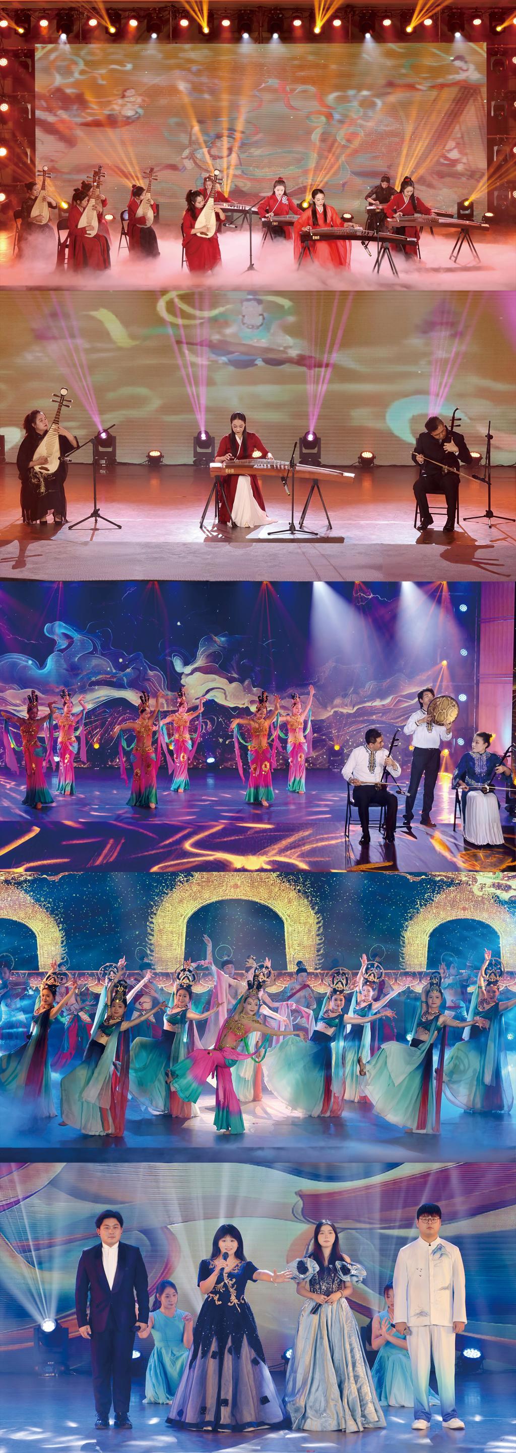 古筝琵琶重奏《玉盘》以航天梦为灵感,用弦音叩问苍穹,将“九天揽月”的浪漫与科技强国的豪情交织;民乐重奏《盛世国乐》再现盛唐“万国衣冠拜冕旒”的开放气象,琵琶、二胡与古筝合鸣,奏出文化自信的强音。《胡旋舞》更以二胡疾弦模拟胡旋舞姿,让白居易诗中“左旋右转不知疲”的西域风情在弓弦间重生。表演唱《千年之约》《丝路新绿》唱出古老的驼黄正在褪去,崭新的绿色在丝绸之路上铺展,用艺术架起“中国梦”与“世界梦”的桥梁,展现了中国在新时代的大国担当。