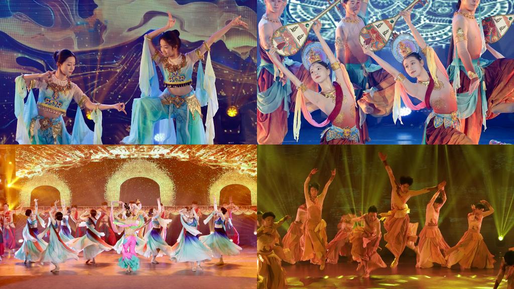 演出以《千年霓裳》敦煌服饰展拉开序幕。敦煌研究院携手莫高学堂艺术家,将壁画中的魏晋至元代服饰从斑驳石壁“请”至舞台,纹样如星辰闪烁,绸缎似历史长河倾泻。华服摇曳间,丝路多民族的审美交融与工艺智慧跃然眼前,引得观众惊叹:“仿佛穿越千年,触摸到了文明的温度!”