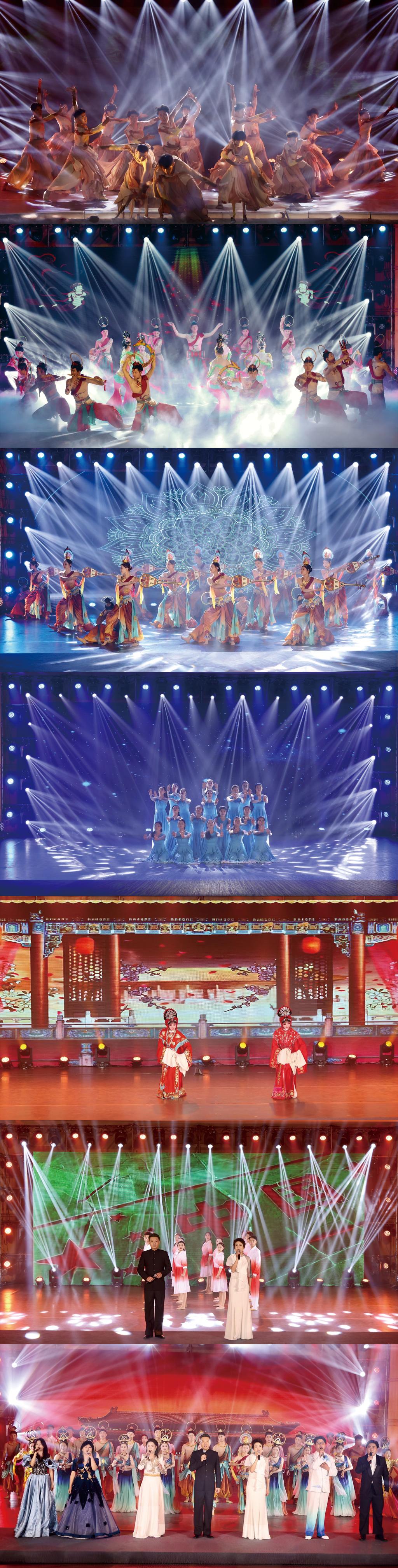 男子群舞《胡杨颂》以苍劲舞姿诠释“生而千年不死”的荒漠脊梁,隐喻丝路文明的坚韧延续。群舞《花开敦煌》《乐净铅华》则让飞天、伎乐天从壁画中苏醒,莲花步与胡旋舞交织,展现文明从沉睡到绽放的“重生”之旅。《丝路畅想》将丝路画卷徐徐展开,展现出对中华文明无限向往的情怀。由甘肃省陇剧院表演的特邀节目陇剧《枫洛池》选段《辨草》,用古韵新声传递文化薪火,演员凭借扎实的功底和真挚的情感,将剧中人物的悲欢离合、命运起伏演绎得淋漓尽致。合唱歌曲《人民江山》《我爱你中国》更将气氛推向高潮,演职人员与观众齐声高歌,用青春誓言告白祖国,文化自豪感在旋律中澎湃激荡,主题演出在经久不息的掌声中圆满落幕。
