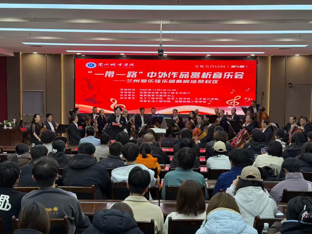 本场音乐会特邀兰州爱乐弦乐团演绎,以“一带一路”为主题,为师生呈现了一场贯通中西的视听盛宴。演出在《同一首歌》的温情旋律中开场,先后呈现了《蓝色多瑙河》《莫扎特弦乐小夜曲》等西方经典,以及《二泉映月》《走西口》等民族乐曲。十余首中外佳作以音符为纽带,勾勒出一条穿越时空的“音乐丝路”,生动诠释了文明互鉴、美美与共的理念。