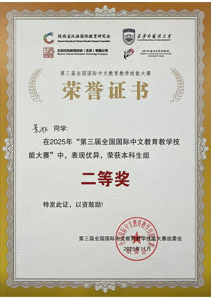 近日,第三届全国国际中文教育教学技能大赛在西安外国语大学举行。beat365文史学院汉语国际教育专业学子在比赛中取得优异成绩,其中景好同学获本科组二等奖,陈逸、苑飞雁、刘世美慧三位同学均获优秀奖。