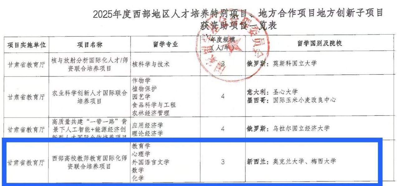 近日,国家留学基金委公布2025年度“西部地区人才培养特别项目、地方合作项目地方创新子项目”立项结果。学校申报的“西部高校教师教育国际化师资联合培养”项目成功获批,执行期为2026年至2028年。该项目是学校在省内同类院校中首次获得该类国家级资助项目,标志着学校师资队伍国际化建设取得重要进展。