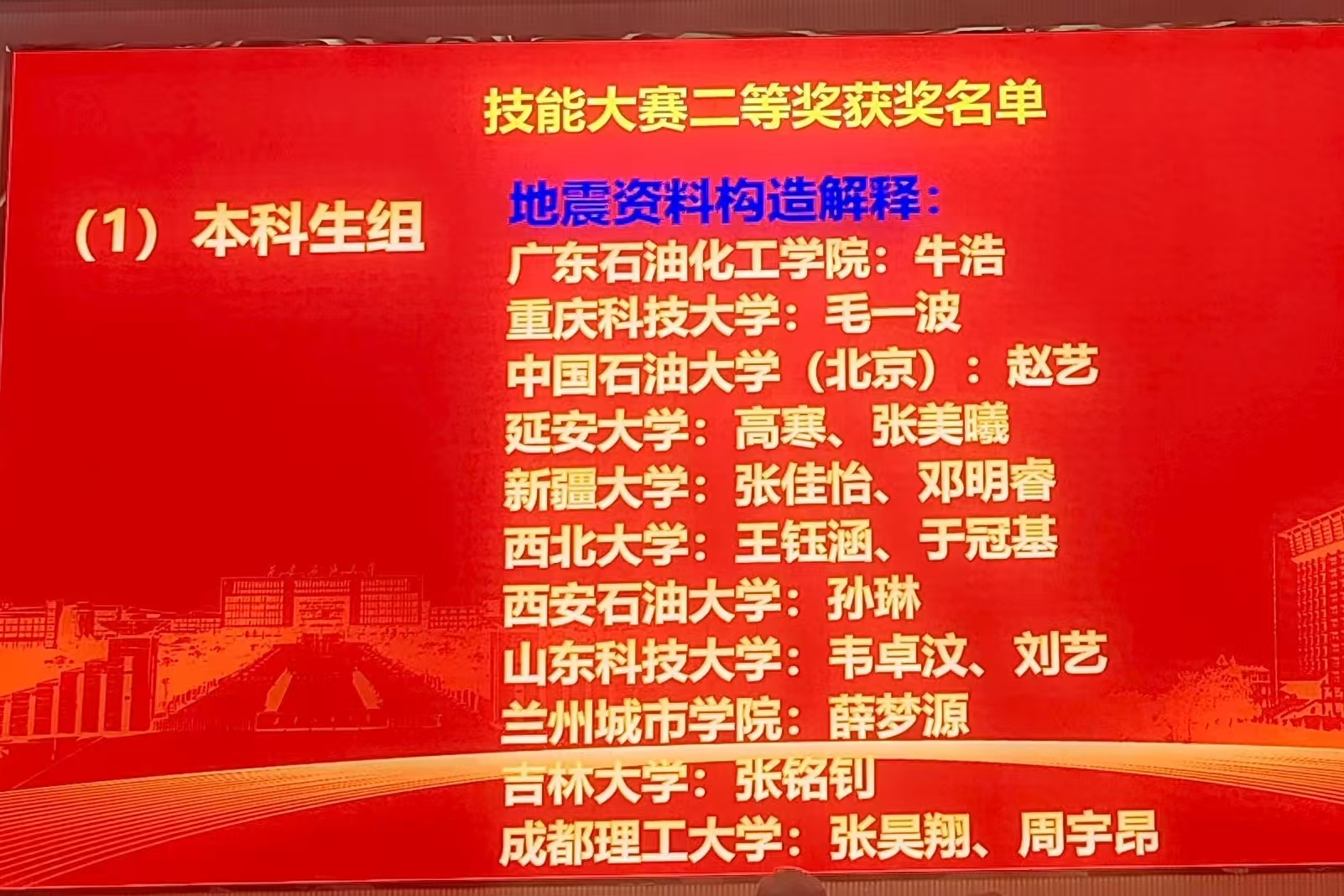 其中,由徐洁老师指导、薛梦源同学完成的地震资料构造解释项目获得国家级二等奖;由陈大友、马东旭两位老师指导,马银月、邵涵磊同学完成的沉积相分析类项目,斩获两项国家级二等奖。三项作品充分体现了学生扎实的理论基础和综合分析能力。