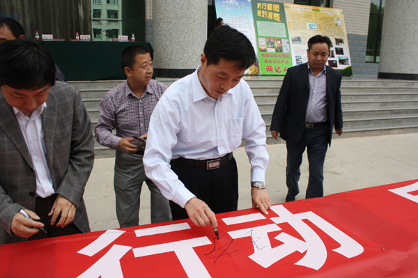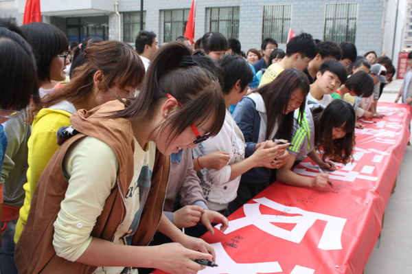 启动仪式后,与会校领导、部门负责同志和学生志愿者共同在“倡导餐桌节约,反对餐桌浪费”条幅上签名,并参观了“厉行节约,反对浪费”宣传展板。