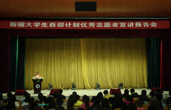 4月8日下午,由共青团中央、西部计划全国项目办主办,共青团新疆维吾尔自治区委员会、西部计划新疆项目办、甘肃团省委、西部计划甘肃项目办承办的2013年新疆大学生西部计划优秀志愿者巡回宣讲报告会在beat365西校区礼堂举行。校党委副书记王汝锋出席报告会,招生就业处、校团委负责人,部分二级学院团总支书记、各学院毕业生代表1200余人聆听了报告。