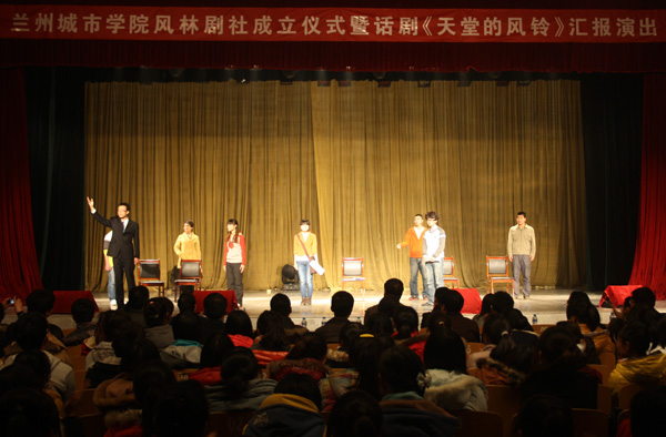 《天堂的风铃》通过讲述学生用到误伤自己的导师,导师非但没有报案,反而以德报怨,将学生送至国外留学的事件,反映了当代大学生真是的内心世界,凸显了人与人之间永恒的爱的主题,弘扬了真、善、美的校园主旋律。在汇报演出中,演员们惟妙惟肖、投入忘我的表演赢得观众阵阵热烈的掌声,经久不息。
