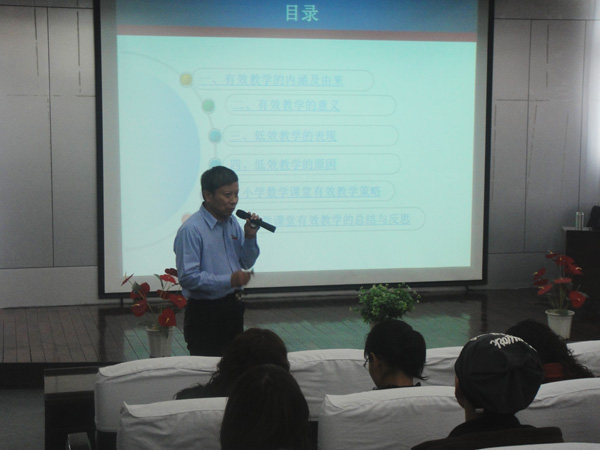 讲座中,宋乃庆教授围绕有效教学的内涵、由来,有效教学的意义,低效教学的表现、原因,小学数学课堂有效教学策略、小学数学课堂有效教学的总结与反思等几个方面对目前小学数学课堂有效教学问题进行了分析探讨。讲座过程中,他还与现场的师生们进行了互动问答,聆听讲座的师生们结合自己的实际工作学习情况作了回答。