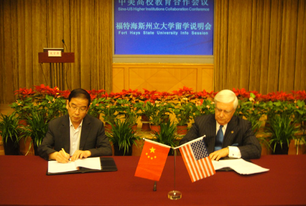 5月26日下午,教育部中国教育国际交流协会中教国际教育交流中心在宁卧庄宾馆举办了中美高校教育合作会议美国福特海斯州立大学留学说明会,甘、青、宁三省区十所大学的领导及国际交流处工作人员参加了说明会、签署了合作备忘录。beat365校长孔庆浩代表学校与美国福特海斯州立大学(Fort Hays State University)校长爱德华海曼德博士签署了beat365官方网站和美国福特海斯州立大学学术合作备忘录。爱德华海曼德博士向参会者介绍了福特海斯州立大学所在地堪萨斯州海斯市、FHSU大学的院系设置、学生来源的构成、教学设施、留学福特海斯州立大学的英语要求(IELTS成绩5.0-5.5)、一年约需费用(12万人民币左右)等情况。