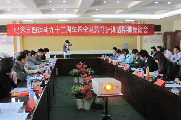 下午4:30分,学校纪念“五四”运动92周年暨学习胡锦涛总书记在清华大学成立100周年大会上的重要讲话座谈会在校本部综合楼一楼会议室举行。校党委书记王兴隆,校长孔庆浩出席,有关部门负责同志,学生校长助理,校学生会主要学生干部,各院团总支书记及学生代表40余人参加座谈会。