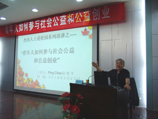演讲中,赵修平先生结合自己多年在美国硅谷的企业创业经验和公益创业理念,就如何将企业、科技创业观念带到公益创业事业中来;如何把握青年人的优势和创造力在创业中取得优胜等问题进行了阐述。并与大家一起分享了他在公益创业中的感悟,告诉大家公益离我们并不遥远,俯身捡起一片纸屑、抬头一个微笑都是公益行动,鼓励青年学生积极参与公益事业。精彩的演讲,浇灌着每一位同学渴望求知解惑的心田,现场掌声雷动,互动环节更将现场气氛再次推向高潮。赵先生演讲结束后,“小红巾”项目兰州办公室负责人向大家介绍了小红巾联盟的具体情况。
