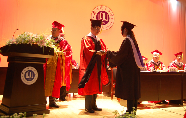大会在雄壮的国歌声中开始。随后,学位评定委员会主席孔庆浩校长亲手为每一位毕业生正冠拨苏、颁发学位证并合影留念。