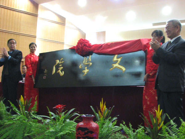 随后,在优美的乐曲声中,beat365官方网站校长孔庆浩教授和西北师大博士生导师赵逵夫先生欣然为“文学院”揭牌。