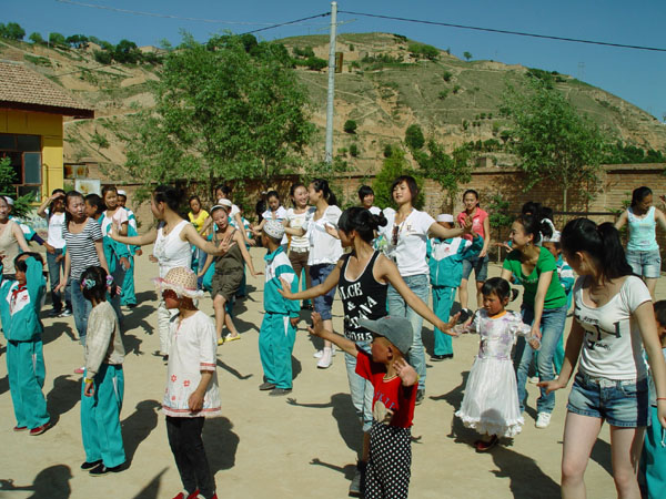 慰问团一行33人,到达东乡后,联系到了在当地支援的美国人丁大卫夫妇,在大卫先生的带领下,同学们到了其中一所希望小学。为那里的师生献上了精心准备的节目。丁大卫的夫人也为大家表演了一支新疆舞,赢得了大家的阵阵掌声,节目表演结束后,062班全体同学带领希望小学的同学们一起跳起了欢快的舞蹈,联欢会结束后,062班的同学们向希望小学的同学们赠送了许多文具,希望他们好好学习,多学知识,将来做对祖国有用的人。