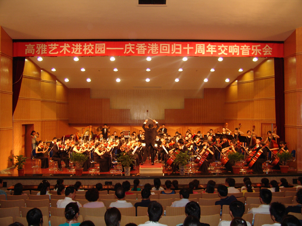 为丰富校园文化生活,提高学生艺术修养,促进学生全面成才,全面推动我院艺术教育的发展,营造校园高雅文化艺术氛围,6月23日晚,由校团委承办的“高雅艺术进校园—庆香港回归十周年大型交响音乐会”在我院音乐厅隆重举行。 省教育厅体卫处杨坚处长、杨文章副处长与我院孔庆浩院长、王汝锋副书记、马振林副院长等应邀出席音乐会。本场是2007年甘肃省普通高校普及高雅艺术活动的第二场演出。活动的主题是:走进大师、聆听经典、陶冶情操、提高素质。
