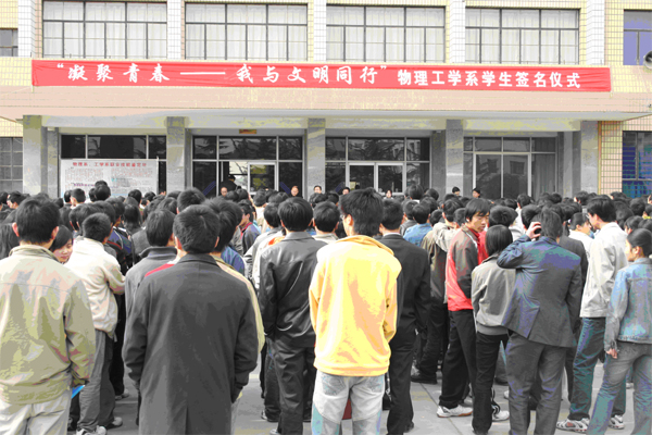 近日,物理工学系学生在培黎校区教二楼前举行了“凝聚青春——我与文明同行”的签字仪式。系党总支书记马立涛、系副主任雒向东、王国伟、李鲤及各班班主任出席了签字仪式,全系学生参加了签字活动。