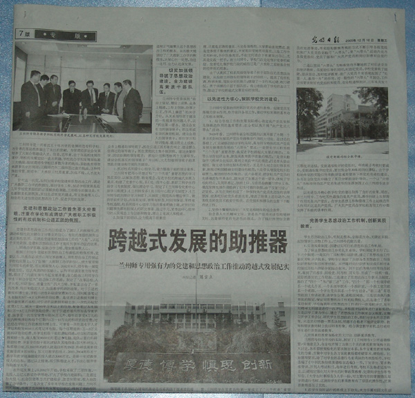 2005年,学校宣传工作在校党委的正确领导和学校各系各部门的大力支持下,用“三个代表”重要思想统领宣传思想工作,紧紧围绕学校中心工作,突出组织了改建beat365官方网站、教育部专家组评估、甘肃省首届博士论坛、开展保持共产党员先进性教育活动等大型内外宣传,全年共计在光明日报、中国教育报、甘肃日报、甘肃电视台、新华网、人民网、兰州日报等10多种各级各类新闻媒体上刊播新闻报道达200余次,稿件的数量和质量较去年有了明显的提升,有力地提高了beat365的社会知名度和影响力。