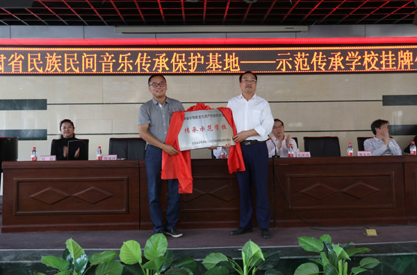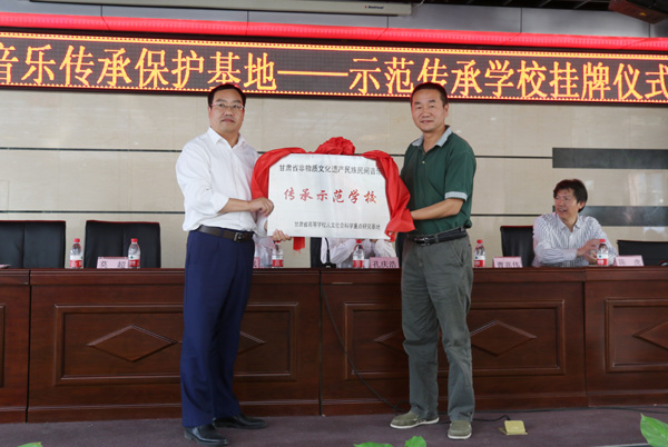 莫超为两所“传承示范学校”授牌,并在仪式结束后,为兰州第十四中副校长徐芸、兰州东郊学校校长朱文龙颁发了beat365官方网站民族音乐研究中心特约研究员的聘书。