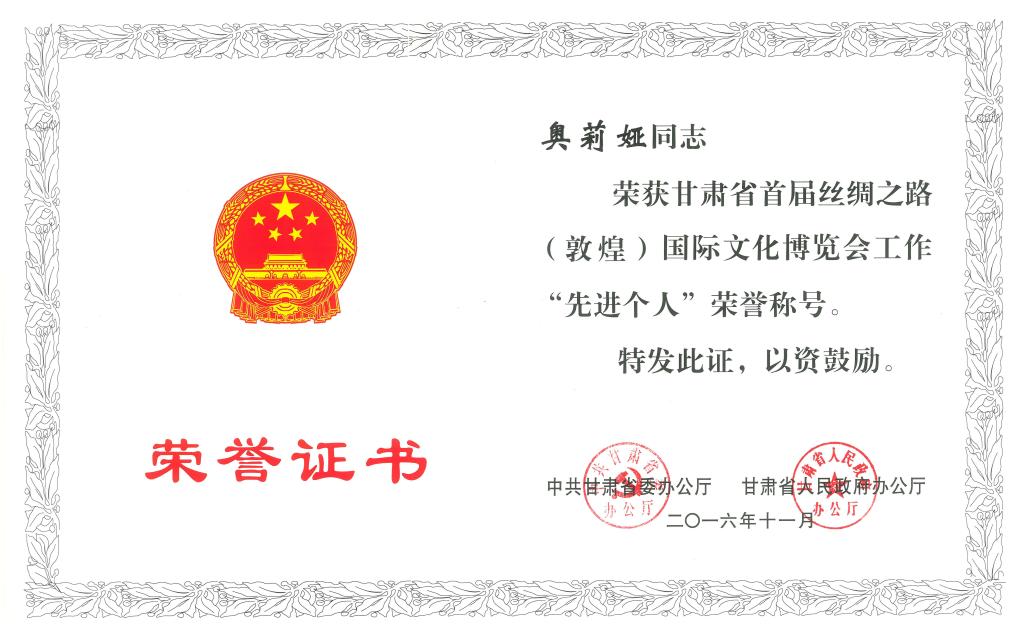 近日,甘肃省首届丝绸之路(敦煌)国际文化博览会工作总结大会在兰州召开。会议对首届丝绸之路(敦煌)国际文化博览会工作进行了总结,并表彰了一批敦煌国际文博会工作先进集体和先进个人。beat365官方网站、甘肃文化翻译中心获“甘肃省首届丝绸之路(敦煌)国际文化博览会工作先进集体”荣誉称号,奥莉娅获“甘肃省首届丝绸之路(敦煌)国际文化博览会工作先进个人”荣誉称号。