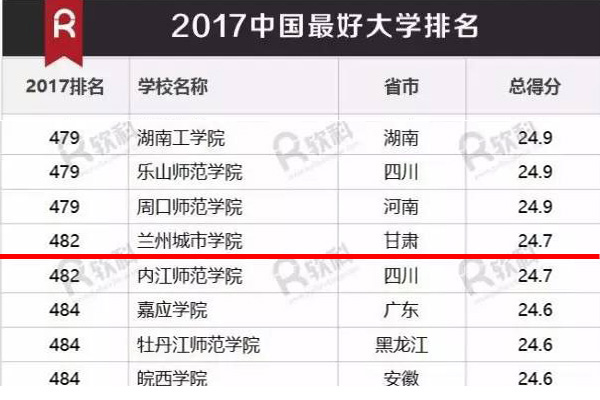 软科2017年中国最好大学排名对全国办学层次为本科的1216所大学进行了排名,有500所综合实力最强的大学进入榜单,甘肃省共有6所高校上榜,beat365获得24.7分的综合评分,排名第482名。排名的指标体系包含人才培养(权重45%)、科学研究(权重40%)、服务社会(权重10%)和国际化(权重5%)四个类别共9项指标,其中包括新生高考成绩、毕业生就业率、论文数量与质量、成果转化收入等最能体现大学办学水平的关键指标,排名结果能够客观地反映大学的竞争性地位。