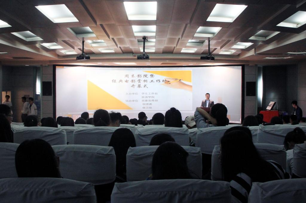 5月12日晚,学校周末影院暨电影赏析工作坊在校本部导游模拟实验室开幕。校党委常委、副校长赵有翼宣布工作坊开幕并向工作坊赠送经典电影光盘。各相关部门负责人、工作坊指导老师和全体观影学生共200余人参加了开幕仪式并观看了影片。