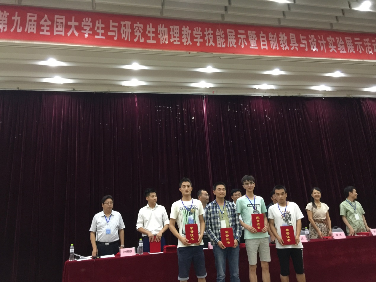7月29日至31日,第九届全国大学生与研究生物理教学技能暨自制教具展评在青岛大学举行。beat365电子与信息工程学院物理系教师张颜萍、柳朝晖及机械工程学院柴昌盛老师共同指导的物理系141班包江波与赵树祥自制的“安培力演示仪”、机械141郭旭东与丁小彬共同制作的“自感现象演示仪”分别获得教具制作一等奖;焊接141陈飞龙与李亮制作的“静电实验演示仪”获得二等奖;张国海同学获得课堂教学技能展示三等奖。张颜萍、柳朝晖、柴昌盛三位老师分别荣获“优秀指导教师”称号。